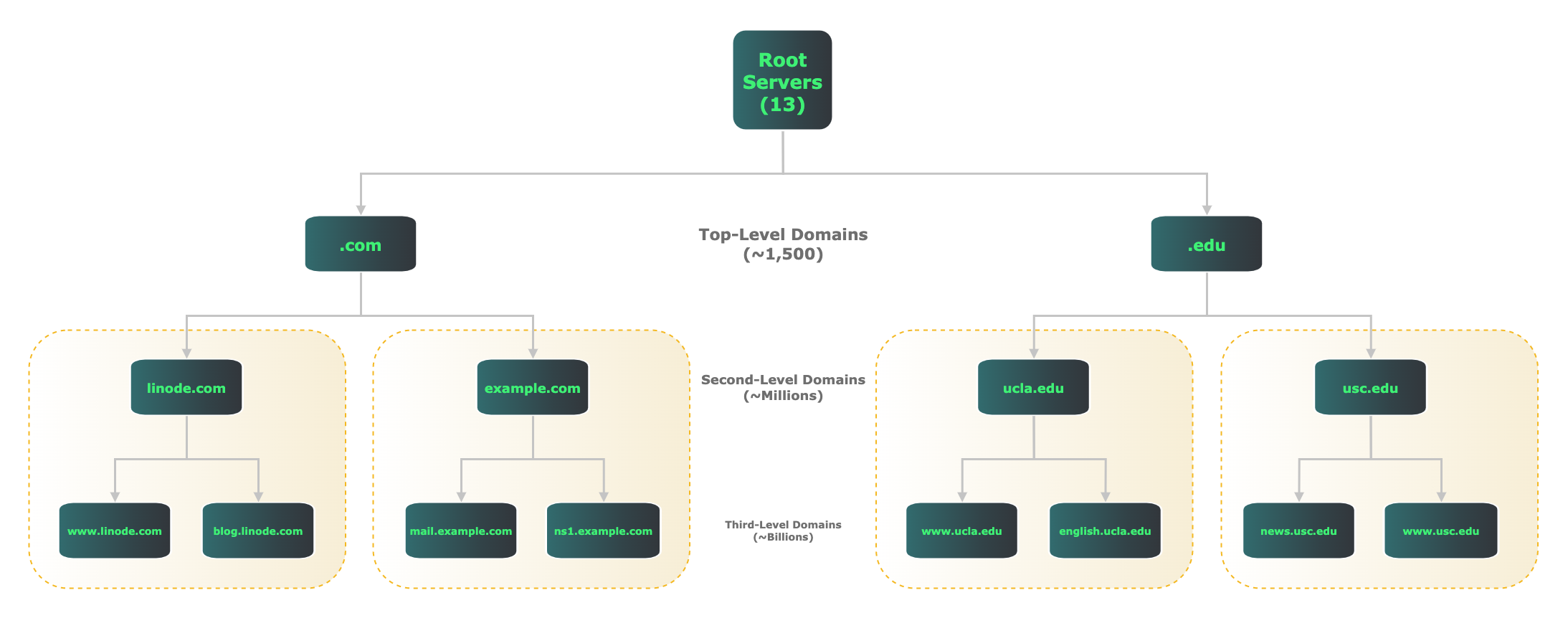 The query starts with a lookup at the Root Name Servers, which direct the query to the appropriate Top-Level Domain (TLD) server based on the domain’s suffix (e.g.,.com,.net,.org).Top-Level Domain (TLD) Server Lookup